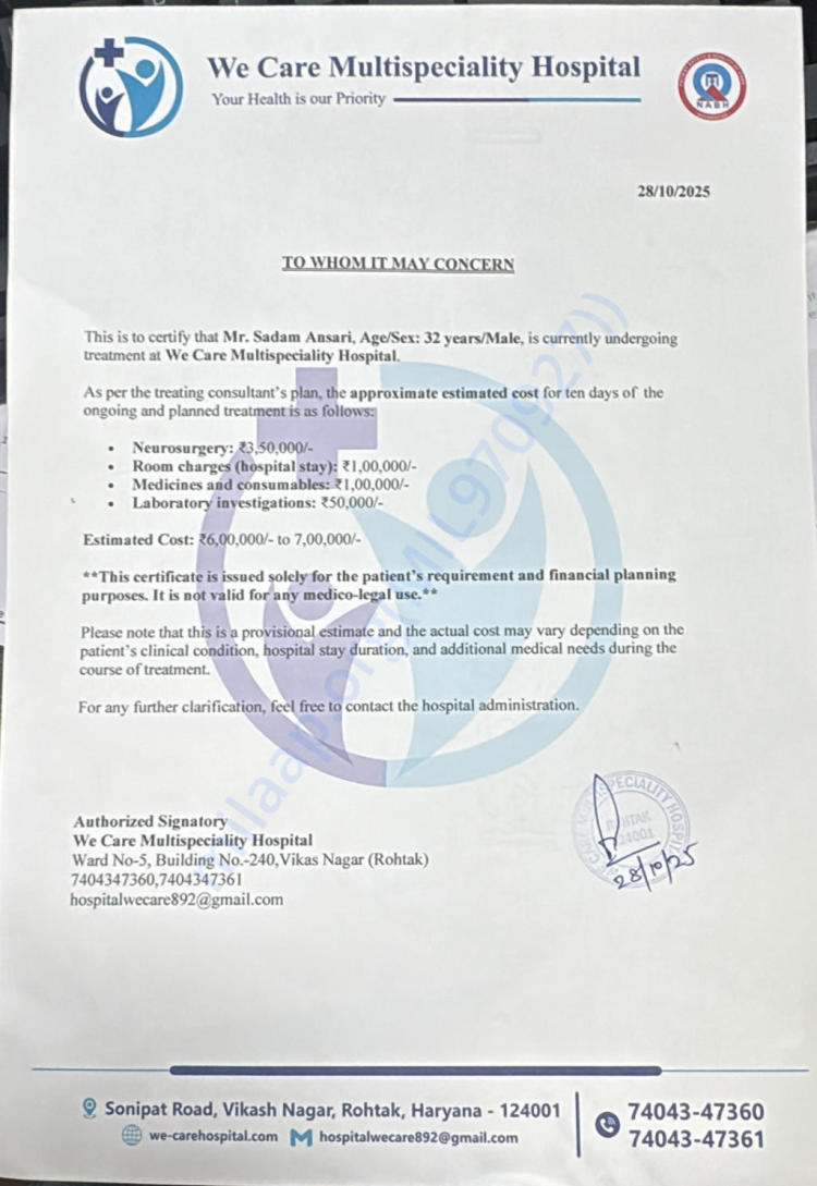 Patient Sadam ansari is 32 years old, living in Farrukhabad, Uttar Pradesh